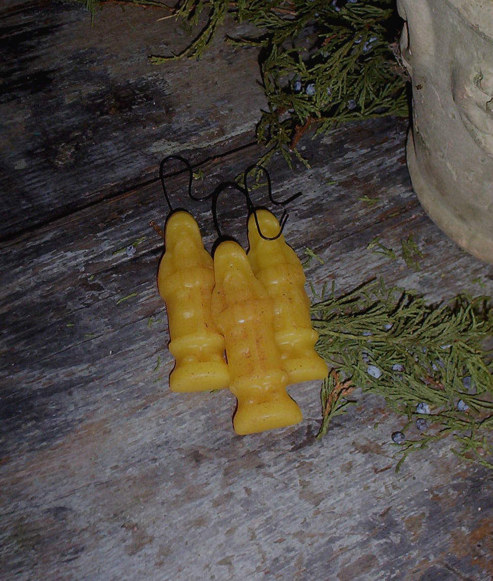 Grungy primitive wonderful Early Look European stlye BELSNICKLE~SANTA ornaments which I hand pour into little Early German molds. These DARLING SANTAS are perfect for the holidays. The little fellows are 3" tall and made using 100% aged beeswax which is a deep dull CREAM ~ HONEY ~ BEESWAX color and have been scented in my own blend of clove. You can see the quaint simple detail to the face and coat! They really are dull in color so any shine in the picture is from my camera. These Belsnickles have a wire hanger and have been dusted with my own spice mixture to give them an extra Olde Worldly look.