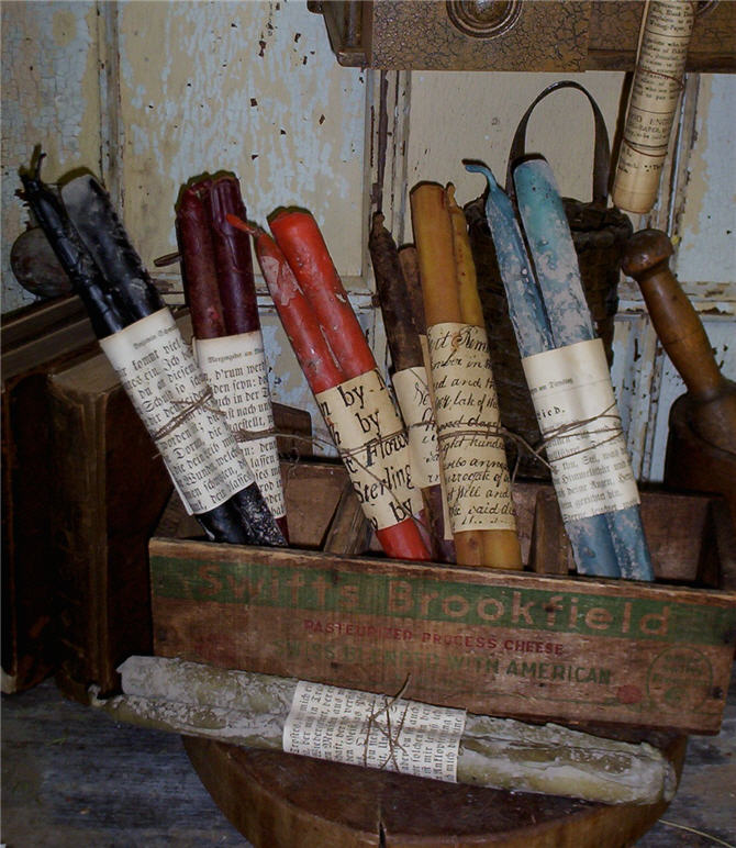Assorted taper pairsapproximately 12" long wrapped in vintage 1800's papers and Monahan Papers aged sheets. Each pair is tied with aged cording.