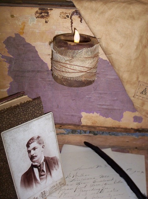 BEAUTIFUL 3"X3" Wired Hanging Pillar Candle with battery operated Flicker Light included. This candle has been made using 100 % aged BEESWAX. Each candle is scented with my own special scent blends. The candle comes with a battery operated flicker light. Just replace the battery when it runs out and this candle will last forever. ~AND~ no more worry and mess if you leave this candle burning when you go out. I also wrapped the candle in walnut dyed early cloth and wired it with aged rusted wite. Wonderful to hand on a peg or horseshoe nail. Perfect on an old board, in an old wooden dough bowl, trencher or on a treen plate alone or surrounded by drieds!