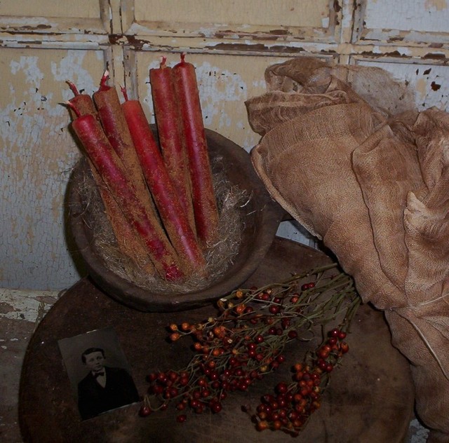 Early Lighting Cranberry Plum Tapers. I created these Tapers using my own special blend of Cranberry and Fresh Plum oils. These ~Cranberry Plum~ Tapers are made by me using 100% PURE BEESWAX. Each candle is rolled in mixed spices to give it a really early settlers' look. They look like they were crudely made in the early settler's days! These candles will come to you as shown. You get SIX, each measuring between 5"-6". They look great in a lantern, chamber stick holder or hog scraper.