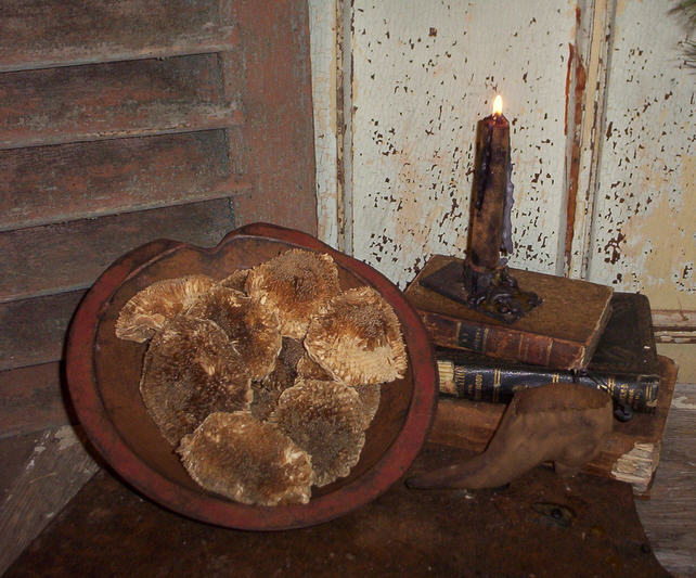 Set of 12 beautiful primitive sunflower heads in a muted mustard/brown/beige color. Sunflower headsare 2" - 3.5" in diameter.