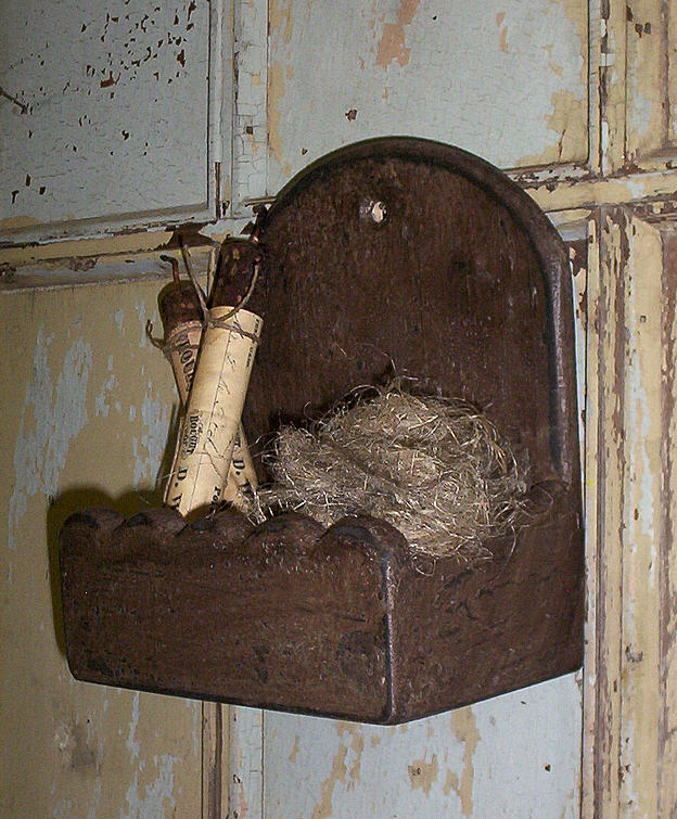 Small Scalloped wall shelf measuring about 4" x 6" x 7". This shelf is colored putty over black.