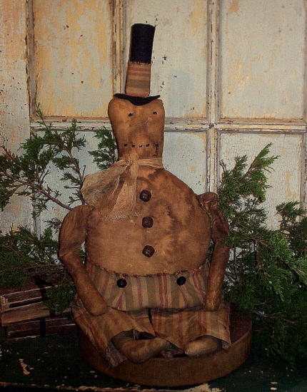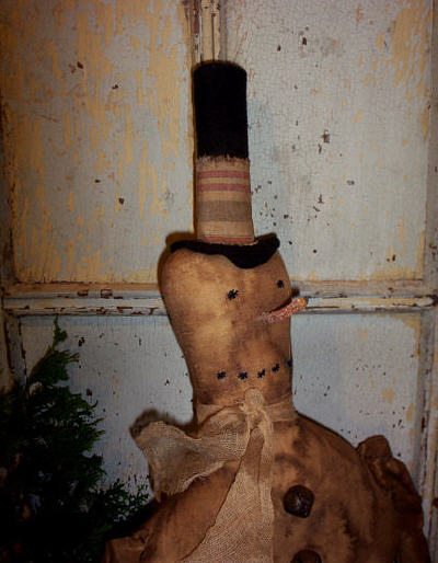 32" Mr. Frosty Snowman with REAL dried carrot nose, felt hat, rusty bell buttons, grungy gauze scarf and over-all style pants held up with black buttons.