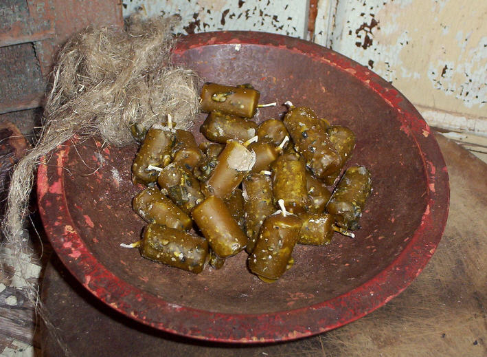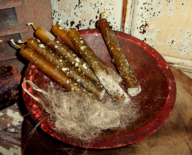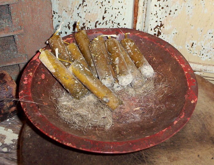 Faux Tallow candles in nubs, stubs and tapers. Made using 100% sweet cream beeswax these candles are a yellowmustard accented with ash pits.