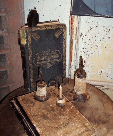 Small, medium and large chamber lights to accent your primitive decor.Made using 100% aged pitch beeswax scented in Colonial Kitchen Spicethese lights have a wire handle and are wrapped grungy gauze.