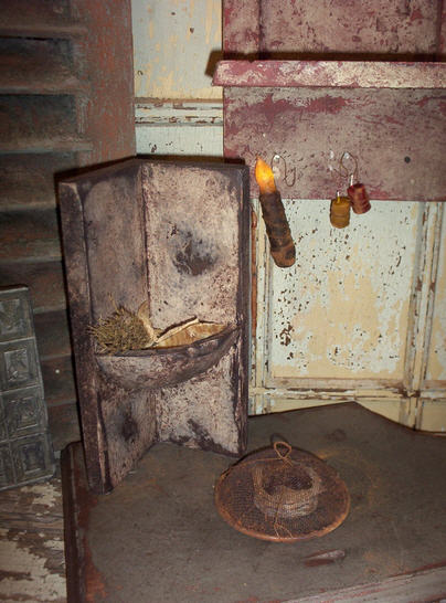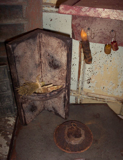 Darling Corner Bowl Cubbie. Chippy painted brwon overdirty white. This cubbie is 11" tal and 6" diagonally across the front. The bowl is perfect for a soap and brush set aswe have it shown here.
