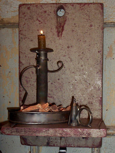 7" X 6.5" aged adjustable candle holder with bowl base and a 2.5" solid pewter candle snuffer. Perfect candle holder forshowing your primitive candles as well as a base that canhold drieds or more candles.