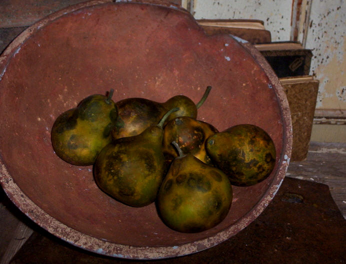 Set/6 Speckled olive pear gourds measuring 2.5"-3.5" in diameter and approximately 4"-5" tall. These are the ultimate primitive pear.