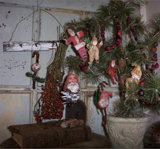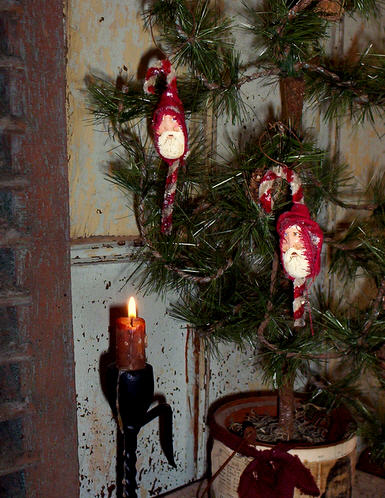 Hand sculpted candy cane Santa. This chenille stem candycane is approximately 5" long. Each Santa is hand sculpted,aged and lighty dusted in Old World Mica.