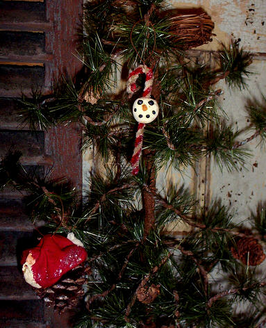 Handsculpted candy cane Snowman. This chenille stemcandy cane is approximately 5" long. Each Santa is handsculpted, aged and lighty dusted in Old World Mica.