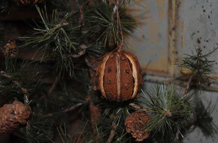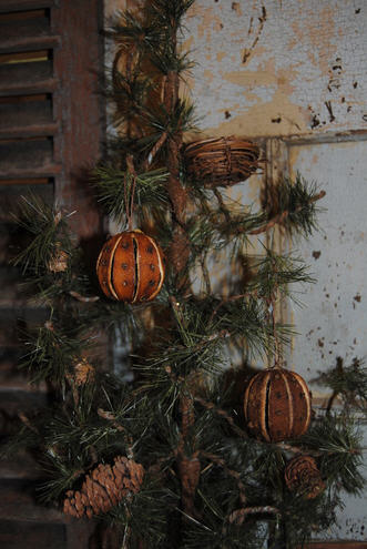 Like our clove studded bowl fillers these are our slit orangesthat we have carefully studded with clove. These areornaments for the tree and the hanger is made using cording.Perfect primitive tree ornament.