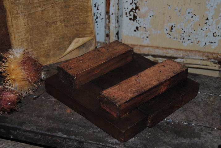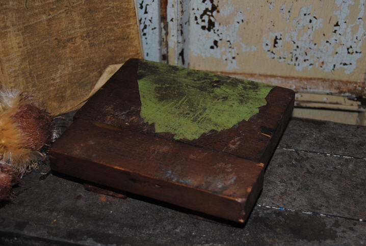 Small chippy brown over green candle boardmeasuring 5" X 5.5". The bottom of this candleboard is footed. This one is made using OLDWOOD. I just love the green paint.