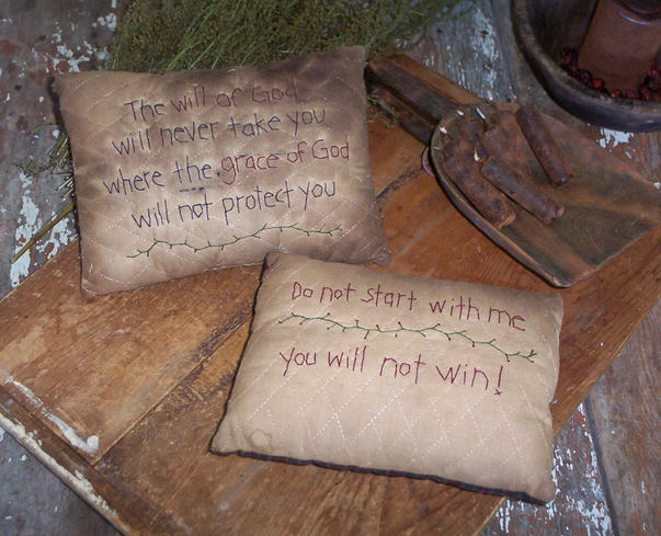 Hand stitched pillow on aged fabric with homespun backing. Size varies based on