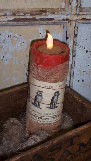 3" x 6" Muted orange pumpkin spice flicker candle, This candle comes wrapped with grungy cheescloth and an 1800's cat image with poem held in place with aged cording. Perfect for the fall holiday or all year long. The grungy flicker light is battery operated and should last 70-80 hours before it needs to be replaced. The entire piece is dusted on a cloved spice blend.