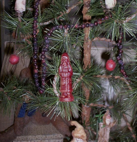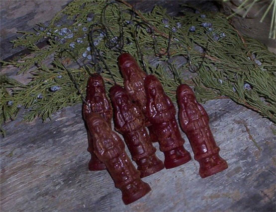 Grungy primitive wonderful Early Look European stlye BELSNICKLE~SANTA ornaments which I hand pour into little Early German molds. These DARLING SANTAS are perfect for the holidays. The little fellows are 3" tall and made using 100% aged beeswax which is a deep dull RED~BURGUNDY color and have been scented in my own blend of SWEET SUGAR PLUMS. You can see the quaint simple detail to the face and coat! They really are dull in color so any shine in the picture is from my camera. These Belsnickles have a wire hanger and have been dusted with my own spice mixture to give them an extra Olde Worldly look.